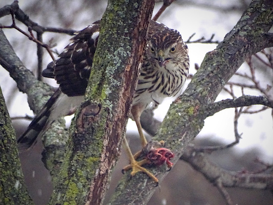 A Cooper’s hawk perched outside the living room window and finishing off his meal (another bird). Personally, I prefer to start my day off with a coffee.